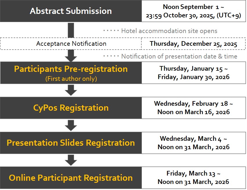 ・If the first author fails to complete the pre-registration by the specified deadline, the abstract will be withdrawn and not included in the printed program. - Both the CyPos slides and the presentation slides must be uploaded via the Presentation slide submission system by the designated deadline.