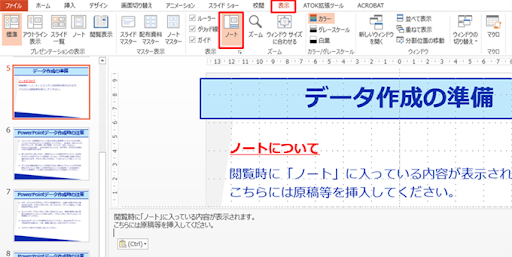 会場の演台PCでは、「ノート」に記入された内容が表示されます。発表用のメモ等を記入してください。